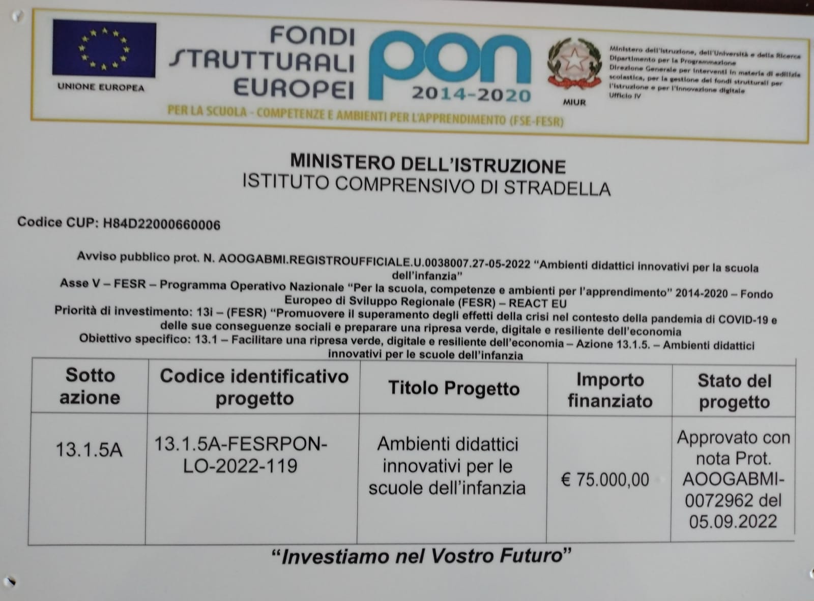 13.1.5A-FESRPON-LO-2022-119 – Ambienti didattici innovativi per le scuole dell’infanzia – 2022 38007 del 27/05/2022 – FESR REACT EU – Ambienti didattici innovativi per la scuola dell'infanzia
