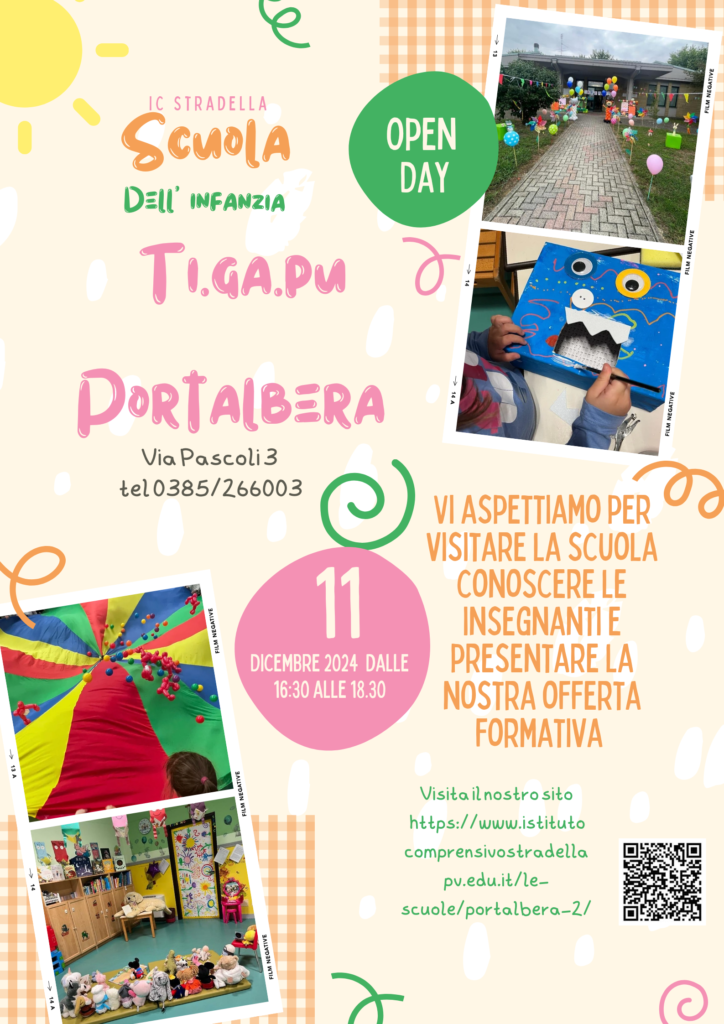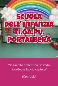 La scuola dell’ infanzia TI.GA.PU. fa parte dell’ Istituto Comprensivo di Stradella. Deve il suo nome all’ acronimo di Tigrotti (bambini di 5 anni TI.) Gattini (bambini di 4 anni GA.) e Pulcini (bambini di 3 anni PU.). La nostra scuola accoglie bambini dai 3 ai 6 anni. E’ composta da 3 sezioni: sez. A trenino verde; sez. B trenino rosso; sez. C trenino giallo . Ogni classe ha 2 docenti e un docente di religione cattolica. Le attività didattiche proposte sono differenziate per età e svolte dalle insegnanti di sezione. Il servizio mensa è gestito dall’Amministrazione Comunale di Portalbera. Per informazioni in merito ai costi e alle modalità di pagamento dei pasti occorre rivolgersi agli uffici comunali. Il servizio di scuolabus è previsto solo per i bambini residenti nel Comune di San Cipriano Po.