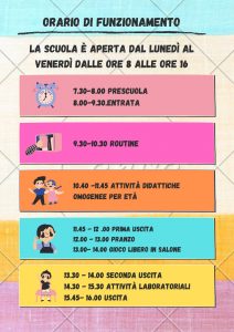 La scuola è aperta dal lunedì al venerdì dalle ore 8.00 alle ore 16.00.